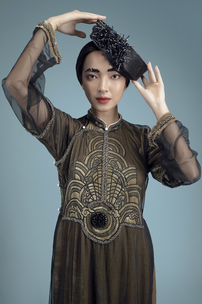Một số chi tiết trong truyền thuyết “Sơn Tinh – Thủy Tinh” được thể hiện trên áo dài của Vũ Việt Hà. Nhà thiết kế thể hiện các trích đoạn theo phong cách tranh cổ Hàng Trống. Mỗi trích đoạn được thể hiện bằng một màu khác nhau, thêu tay…